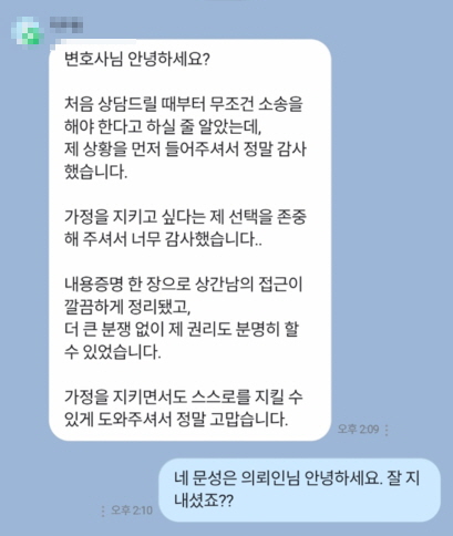 상간남에게 경고는 확실히 하되, 가정을 유지하기 위해 이혼 없이 사건을 종결하고 싶었습니다.